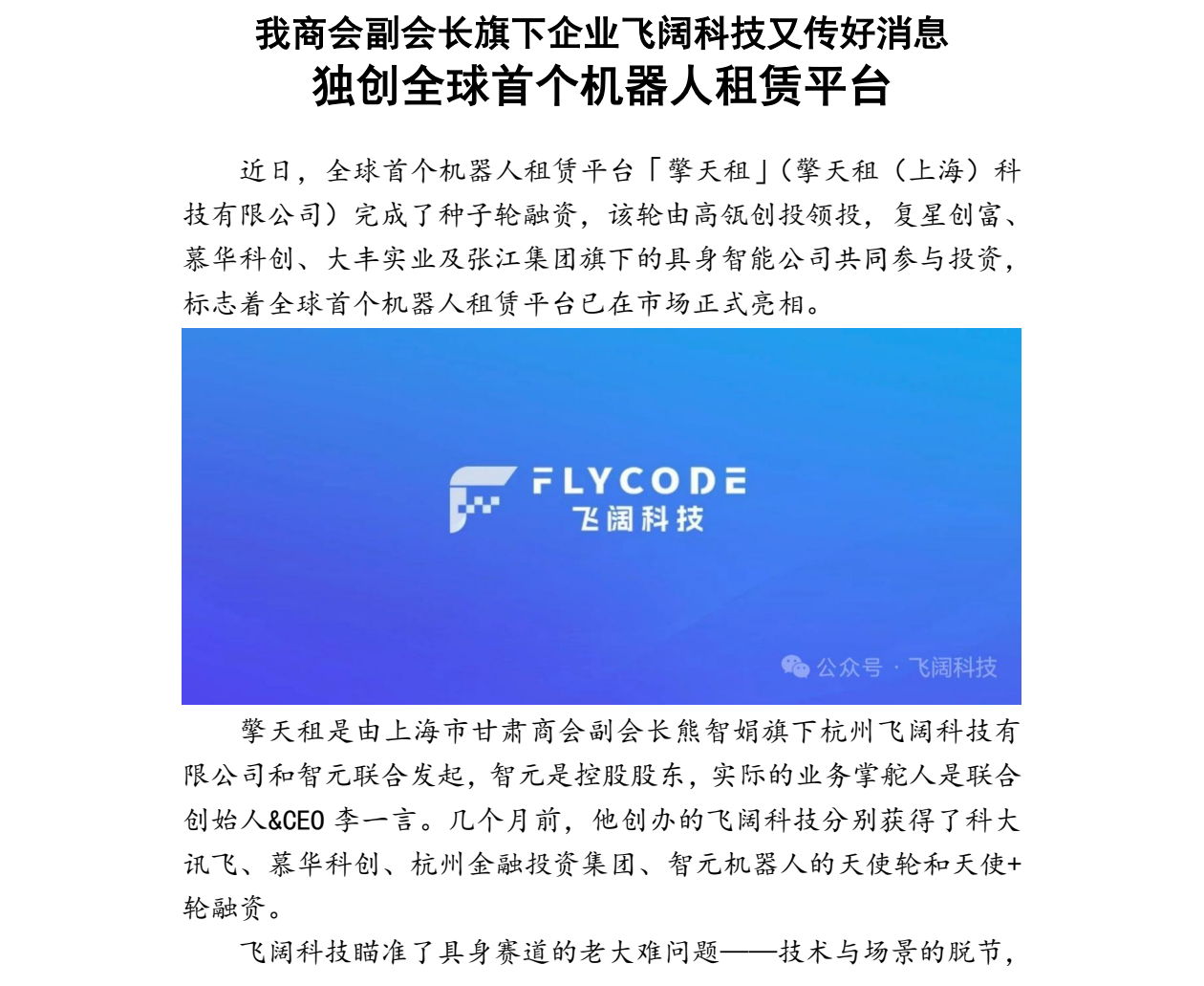 我商会副会长旗下企业飞阔科技又传好消息 独创全球首个机器人租赁平台