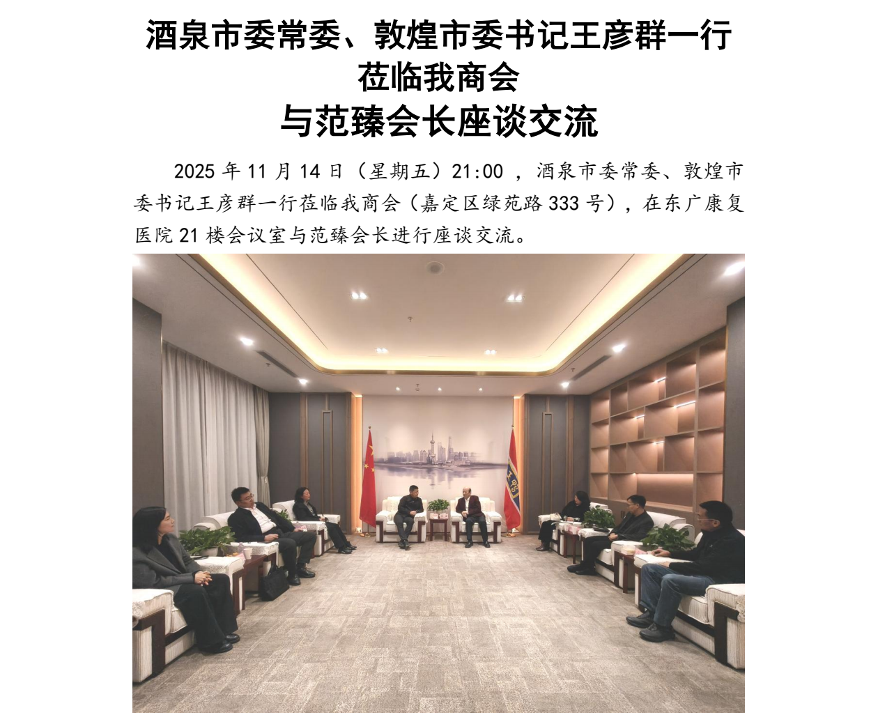 酒泉市委常委、敦煌市委书记王彦群一行莅临我商会 与范臻会长座谈交流