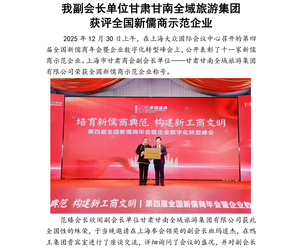 我商会副会长单位甘肃甘南全域旅游集团获评全国新儒商示范企业