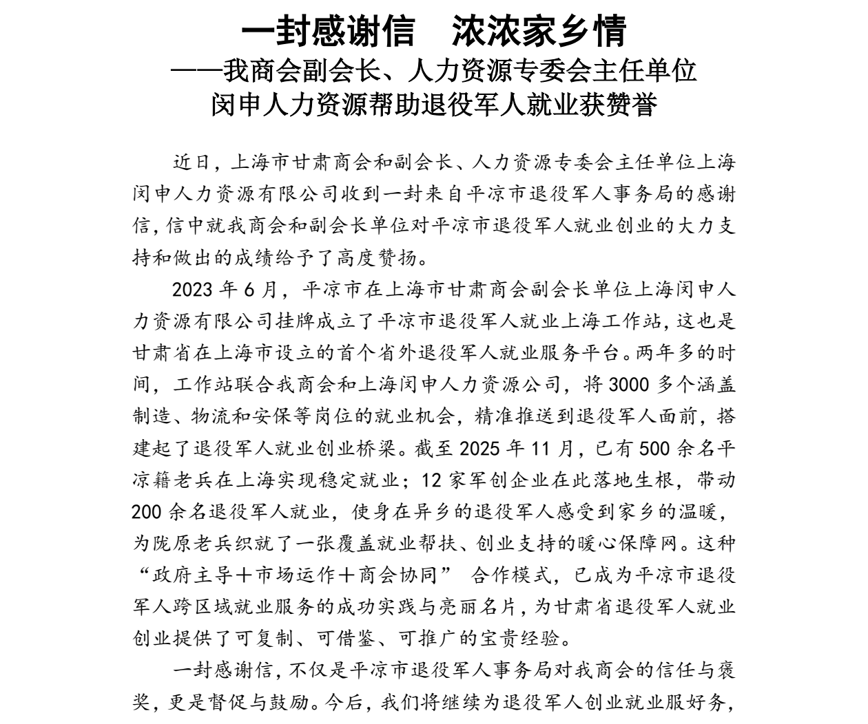 我商会副会长、人力资源专委会主任单位闵申人力资源帮助退役军人就业获赞誉